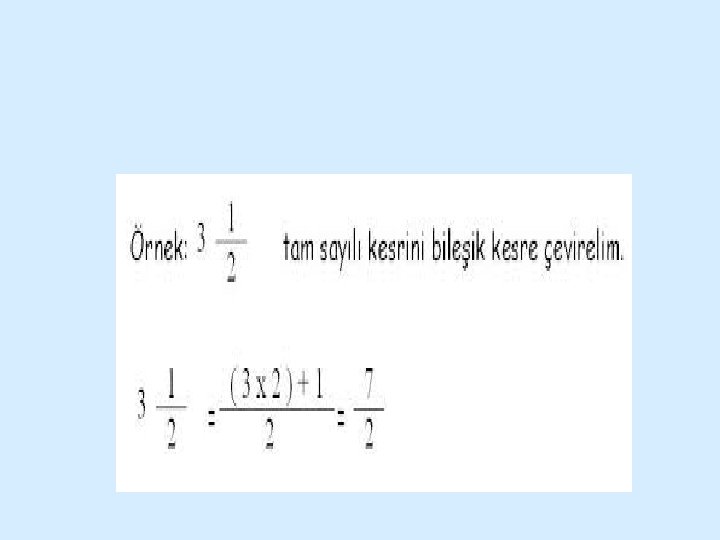 TAM SAYILI KESRİ BİLEŞİK KESRE ÇEVİRME Bir tam sayılı kesri bileşik kesre dönüştürürken kesrin paydası ile tam sayı çarpılır ve bulunan sonuca kesrin payı eklenerek paya yazılır.