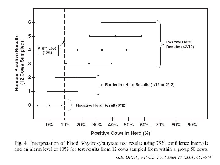 Sampling logistics • In a herd with 50 to 1000 cows, if a prevalence of “positive” tests – e. g. NEFA ≥ 0. 5 or BHB ≥ 1400 • And ≥ 10% is the threshold of interest • And you wish to be 75% confident of detecting this level of problem, then… • 13 samples are required • Oetzel proposes using 12 samples for NEFA and BHB blood testing for investigations