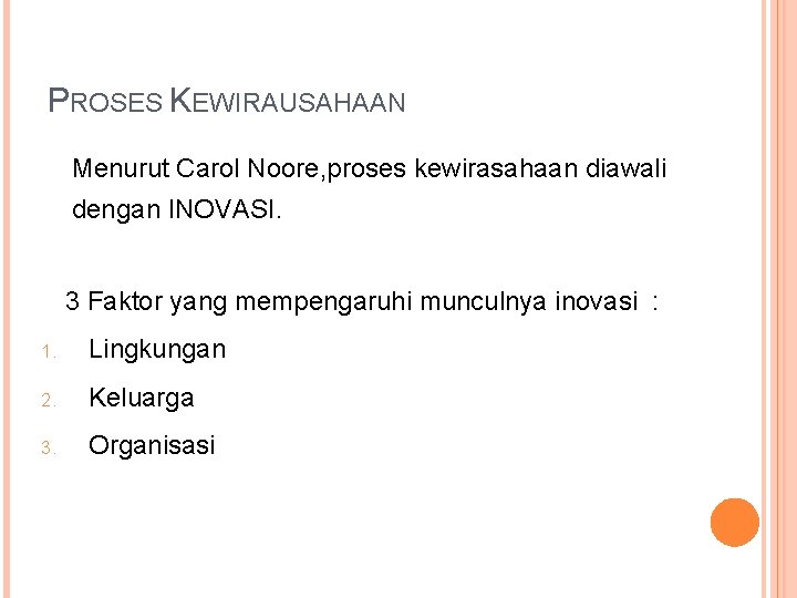 PROSES KEWIRAUSAHAAN Menurut Carol Noore, proses kewirasahaan diawali dengan INOVASI. 3 Faktor yang mempengaruhi munculnya inovasi : 1. Lingkungan 2. Keluarga 3. Organisasi
