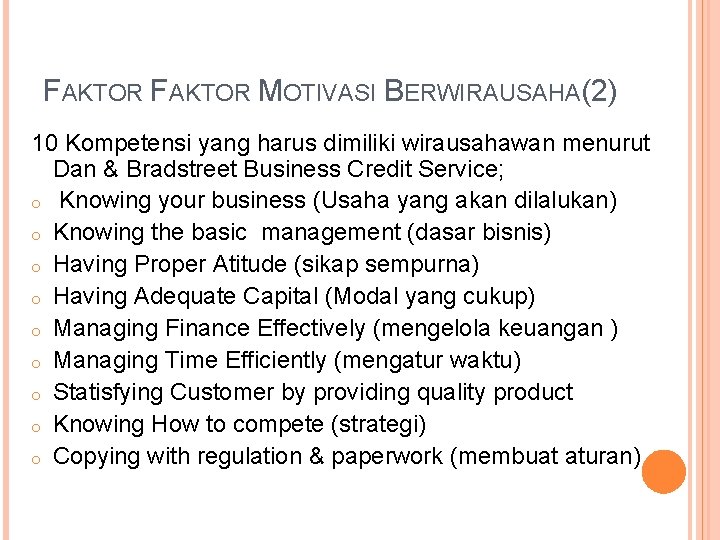 FAKTOR MOTIVASI BERWIRAUSAHA(2) 10 Kompetensi yang harus dimiliki wirausahawan menurut Dan & Bradstreet Business Credit Service; o Knowing your business (Usaha yang akan dilalukan) o Knowing the basic management (dasar bisnis) o Having Proper Atitude (sikap sempurna) o Having Adequate Capital (Modal yang cukup) o Managing Finance Effectively (mengelola keuangan ) o Managing Time Efficiently (mengatur waktu) o Statisfying Customer by providing quality product o Knowing How to compete (strategi) o Copying with regulation & paperwork (membuat aturan)