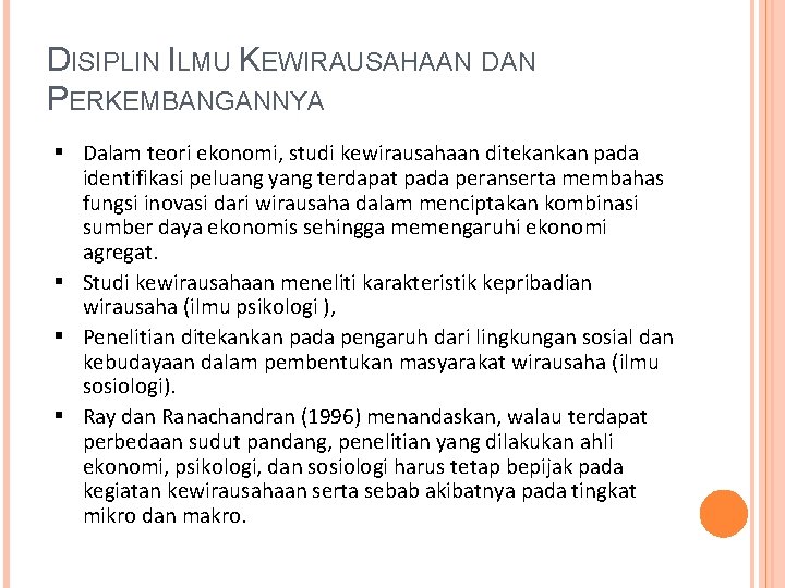 DISIPLIN ILMU KEWIRAUSAHAAN DAN PERKEMBANGANNYA Dalam teori ekonomi, studi kewirausahaan ditekankan pada identifikasi peluang yang terdapat pada peranserta membahas fungsi inovasi dari wirausaha dalam menciptakan kombinasi sumber daya ekonomis sehingga memengaruhi ekonomi agregat. Studi kewirausahaan meneliti karakteristik kepribadian wirausaha (ilmu psikologi ), Penelitian ditekankan pada pengaruh dari lingkungan sosial dan kebudayaan dalam pembentukan masyarakat wirausaha (ilmu sosiologi). Ray dan Ranachandran (1996) menandaskan, walau terdapat perbedaan sudut pandang, penelitian yang dilakukan ahli ekonomi, psikologi, dan sosiologi harus tetap bepijak pada kegiatan kewirausahaan serta sebab akibatnya pada tingkat mikro dan makro.