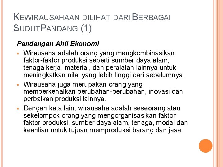 KEWIRAUSAHAAN DILIHAT DARI BERBAGAI SUDUTPANDANG (1) Pandangan Ahli Ekonomi Wirausaha adalah orang yang mengkombinasikan faktor-faktor produksi seperti sumber daya alam, tenaga kerja, material, dan peralatan lainnya untuk meningkatkan nilai yang lebih tinggi dari sebelumnya. Wirausaha juga merupakan orang yang memperkenalkan perubahan-perubahan, inovasi dan perbaikan produksi lainnya. Dengan kata lain, wirausaha adalah seseorang atau sekelompok orang yang mengorganisasikan faktor produksi, sumber daya alam, tenaga, modal dan keahlian untuk tujuan memproduksi barang dan jasa.