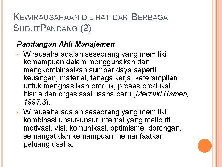 KEWIRAUSAHAAN DILIHAT DARI BERBAGAI SUDUTPANDANG (2) Pandangan Ahli Manajemen Wirausaha adalah seseorang yang memiliki kemampuan dalam menggunakan dan mengkombinasikan sumber daya seperti keuangan, material, tenaga kerja, keterampilan untuk menghasilkan produk, proses produksi, bisnis dan orgasisasi usaha baru (Marzuki Usman, 1997: 3). Wirausaha adalah seseorang yang memiliki kombinasi unsur-unsur internal yang meliputi motivasi, visi, komunikasi, optimisme, dorongan, semangat dan kemampuan memanfaatkan peluang usaha.