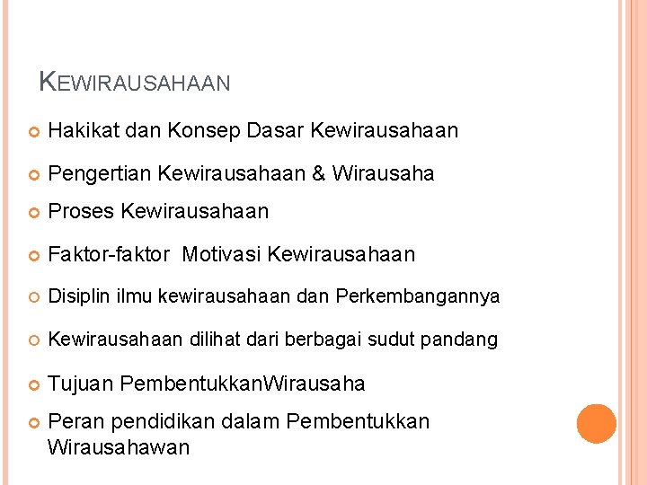 KEWIRAUSAHAAN Hakikat dan Konsep Dasar Kewirausahaan Pengertian Kewirausahaan & Wirausaha Proses Kewirausahaan Faktor-faktor Motivasi Kewirausahaan Disiplin ilmu kewirausahaan dan Perkembangannya Kewirausahaan dilihat dari berbagai sudut pandang Tujuan Pembentukkan. Wirausaha Peran pendidikan dalam Pembentukkan Wirausahawan