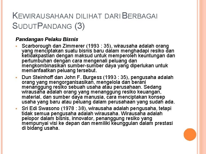 KEWIRAUSAHAAN DILIHAT DARI BERBAGAI SUDUTPANDANG (3) Pandangan Pelaku Bisnis Scarborough dan Zimmerer (1993 : 35), wirausaha adalah orang yang menciptakan suatu bisnis baru dalam menghadapi resiko dan ketidakpastian dengan maksud untuk memperoleh keuntungan dan pertumbuhan dengan cara mengenali peluang dan mengkombinasikan sumber-sumber daya yang diperlukan untuk memanfaatkan peluang tersebut. Dun Steinhoff dan John F. Burgess (1993 : 35), pengusaha adalah orang yang mengorganisasikan, mengelola dan berani menanggung resiko sebuah usaha atau perusahaan. Sedang wirausaha adalah orang yang menanggung resiko keuangan, material, dan sumber daya manusia, cara menciptakan konsep usaha yang baru atau peluang dalam perusahaan yang sudah ada. Sri Edi Swasono (1978 : 38), wirausaha adalah pengusaha, tetapi tidak semua pengusaha adalah wirausaha. Wirausaha adalah pelopor dalam bisnis, innovator, penanggung resiko yang mempunyai visi ke depan dan memiliki keunggulan dalam prestasi di bidang usaha.