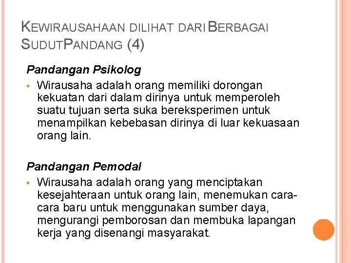 KEWIRAUSAHAAN DILIHAT DARI BERBAGAI SUDUTPANDANG (4) Pandangan Psikolog Wirausaha adalah orang memiliki dorongan kekuatan dari dalam dirinya untuk memperoleh suatu tujuan serta suka bereksperimen untuk menampilkan kebebasan dirinya di luar kekuasaan orang lain. Pandangan Pemodal Wirausaha adalah orang yang menciptakan kesejahteraan untuk orang lain, menemukan cara baru untuk menggunakan sumber daya, mengurangi pemborosan dan membuka lapangan kerja yang disenangi masyarakat.