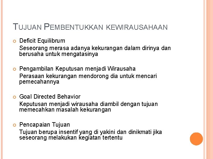 TUJUAN PEMBENTUKKAN KEWIRAUSAHAAN Deficit Equilibrum Seseorang merasa adanya kekurangan dalam dirinya dan berusaha untuk mengatasinya Pengambilan Keputusan menjadi Wirausaha Perasaan kekurangan mendorong dia untuk mencari pemecahannya Goal Directed Behavior Keputusan menjadi wirausaha diambil dengan tujuan memecahkan masalah kekurangan Pencapaian Tujuan berupa insentif yang di yakini dan dinikmati jika seseorang melakukan kegiatan tertentu