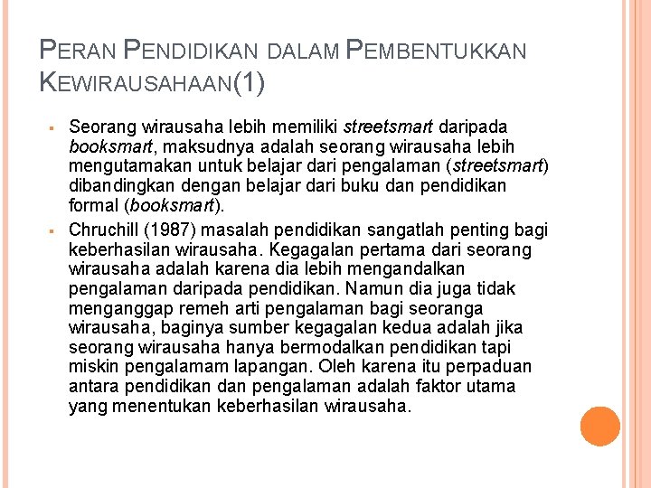 PERAN PENDIDIKAN DALAM PEMBENTUKKAN KEWIRAUSAHAAN(1) Seorang wirausaha lebih memiliki streetsmart daripada booksmart, maksudnya adalah seorang wirausaha lebih mengutamakan untuk belajar dari pengalaman (streetsmart) dibandingkan dengan belajar dari buku dan pendidikan formal (booksmart). Chruchill (1987) masalah pendidikan sangatlah penting bagi keberhasilan wirausaha. Kegagalan pertama dari seorang wirausaha adalah karena dia lebih mengandalkan pengalaman daripada pendidikan. Namun dia juga tidak menganggap remeh arti pengalaman bagi seoranga wirausaha, baginya sumber kegagalan kedua adalah jika seorang wirausaha hanya bermodalkan pendidikan tapi miskin pengalamam lapangan. Oleh karena itu perpaduan antara pendidikan dan pengalaman adalah faktor utama yang menentukan keberhasilan wirausaha.