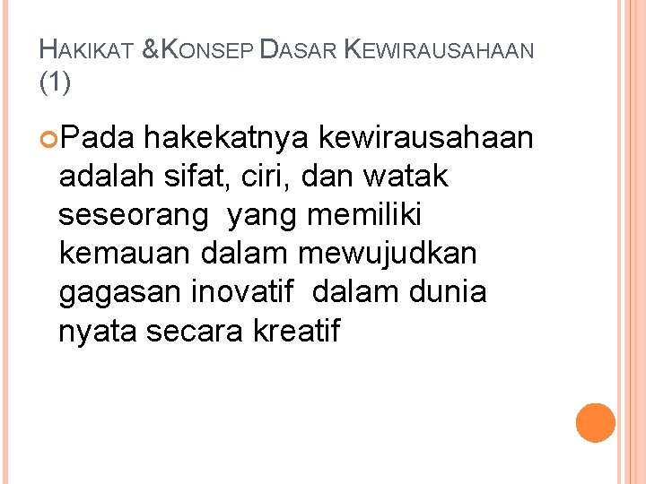 HAKIKAT & KONSEP DASAR KEWIRAUSAHAAN (1) Pada hakekatnya kewirausahaan adalah sifat, ciri, dan watak seseorang yang memiliki kemauan dalam mewujudkan gagasan inovatif dalam dunia nyata secara kreatif