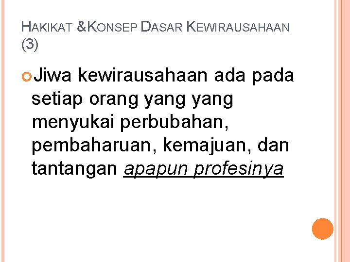 HAKIKAT & KONSEP DASAR KEWIRAUSAHAAN (3) Jiwa kewirausahaan ada pada setiap orang yang menyukai perbubahan, pembaharuan, kemajuan, dan tantangan apapun profesinya
