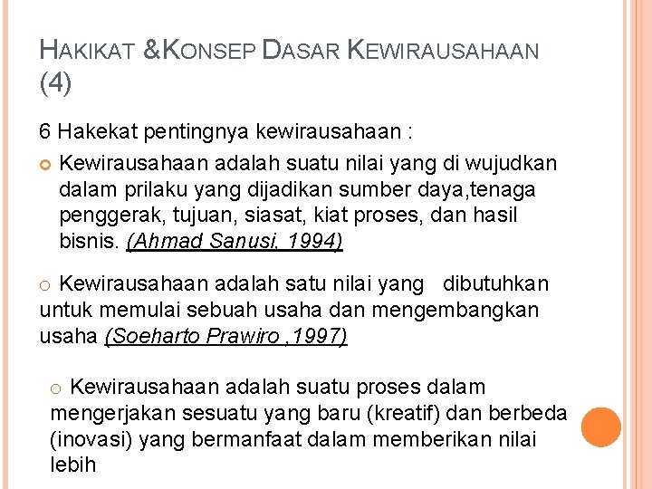 HAKIKAT & KONSEP DASAR KEWIRAUSAHAAN (2) Seorang wirausahawan tidak hanya dapat berencana, berkata tetapi juga berbuat merealisasikan rencana-rencana dalam pikirannya ke dalam suatu tindakan yang berorientasi pada sukses.