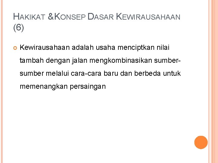 HAKIKAT & KONSEP DASAR KEWIRAUSAHAAN (6) Kewirausahaan adalah usaha menciptkan nilai tambah dengan jalan mengkombinasikan sumber melalui cara-cara baru dan berbeda untuk memenangkan persaingan