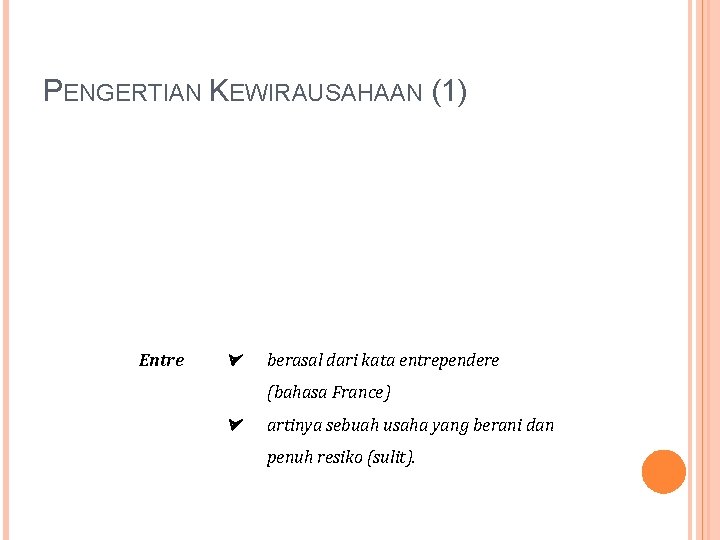 PENGERTIAN KEWIRAUSAHAAN (1) Entre berasal dari kata entrependere (bahasa France) artinya sebuah usaha yang berani dan penuh resiko (sulit).