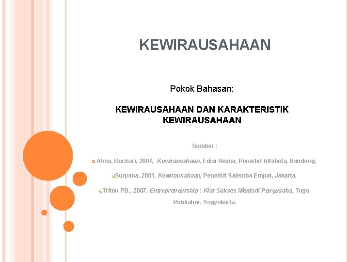 KEWIRAUSAHAAN Pokok Bahasan: KEWIRAUSAHAAN DAN KARAKTERISTIK KEWIRAUSAHAAN Sumber : q Alma, Buchari, 2007, Kewirausahaan, Edisi Revisi, Penerbit Alfabeta, Bandung. q. Suryana, q. Triton 2001, Kewirausahaan, Penerbit Salemba Empat, Jakarta. PB. , 2007, Entrepreneurship : Kiat Sukses Menjadi Pengusaha, Tugu Publisher, Yogyakarta.