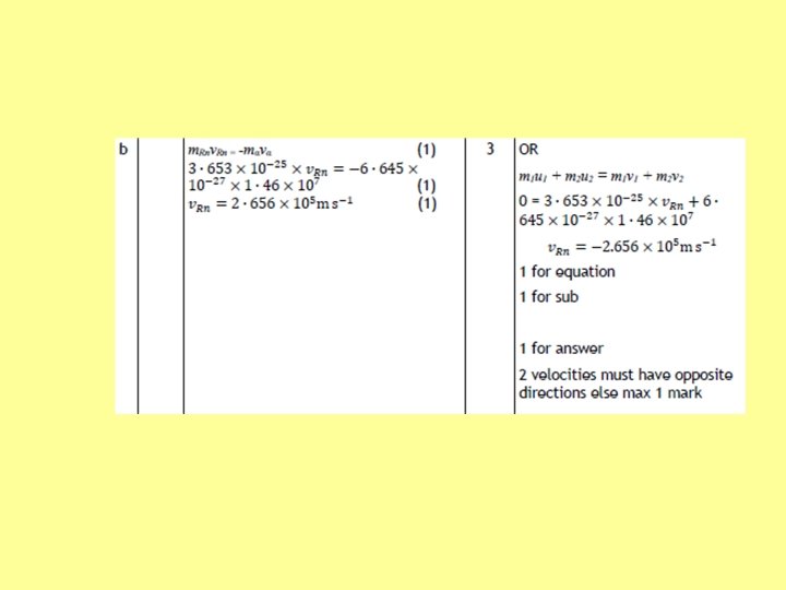 Example • Find the energy given out by this reaction • 235 U + 1 n 134 Te + 98 Zr + 4 1 n → 92 0 52 40 0 • First find the mass both before and after • Mass LHS: 3. 901 x 10 -25 + 0. 017 x 10 -25 = 3. 918 x 10 -25 kg • Mass RHS: 2. 221 x 10 -25 + 1. 626 x 10 -25 + 4 x (0. 017 x 10 -25) = 3. 915 x 10 -25 kg • Difference in mass, Δm = 3. 918 x 10 -25 – 3. 915 x 10 -25 = 0. 003 x 10 -25 kg • E = mc 2 = 0. 003 x 10 -25 x (3 x 108)2 • E = 2. 7 x 10 -11 J