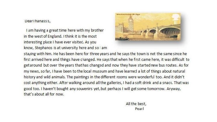 When we follow this formula, the postcard should look like the following: Dear _____, I am in _____. We are having a great time and we’re meeting______. We have done a lot of things since we arrived. We have visited _______. We have also _________. Yesterday we _____. On Monday we’re going to visit ___________. Wish you were here. Love, _____