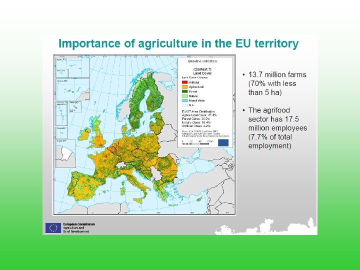 Política Agrícola Común La agricultura en la UE Áreas rurales 90% del territorio 50% de la población 60. 000 € de exportaciones agrícolas