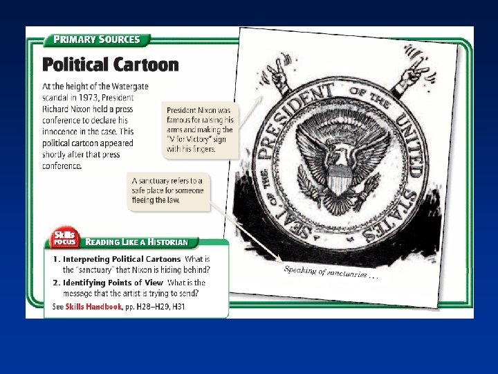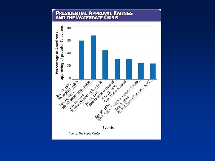 The Watergate Scandal The Crisis Continues Nixon Resigns • Nixon continued to deny his involvement in the break-in or a cover-up. • The Supreme Court ruled that Nixon must hand over the tapes. (U. S. v Nixon) • Public confidence in Nixon was very low. • At the same time, the House Judiciary Committee voted to recommend impeachment. • The White House revealed that an 18 -minute portion of the tape had been erased. • There were calls for impeachment. • Nixon released some transcripts of the tapes in the spring of 1974. • On August 9, 1974, Nixon resigned the presidency. • Gerald Ford assumed the presidency on that same day.