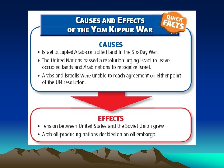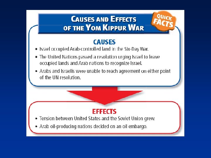 Trouble in the Middle East • 1967 Six-Day War – resulted in Israel occupying territory that had belonged to the nations of Egypt, Syria, and Jordan – The United Nations passed a resolution that called for Israel to withdraw from these lands and for the Arab states to recognize Israel’s right to exist • 1973 Yom Kippur War – Egypt and Syria attacked Israel, and the fighting affected the United States. • Threat of Soviet involvement could turn conflict into a superpower confrontation • Imposition of an oil embargo