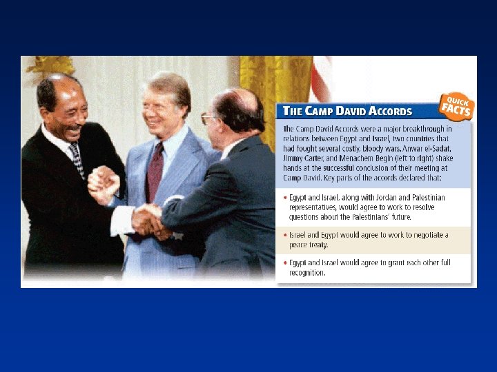 Carter’s Foreign Policy Panama Canal • American control of the Panama Canal had been a source of conflict between the two countries. • In 1977 Carter and Panama’s leader agreed that Panama would take control of the canal by the end of 1999. • The Senate narrowly approved the treaties. • For some Americans, loss of control of the canal represented a decline in American power. Camp David Accords • Greatest foreign-policy achievement • Conflict between Egypt and Israel continued. Egypt would not recognize Israel and Israel continued to occupy Egyptian territory. • Carter guided Anwar el-Sadat and Menachem Begin to a historic agreement that came to be called the Camp David Accords. • Begin and Sadat won the Nobel Peace Prize in 1979.