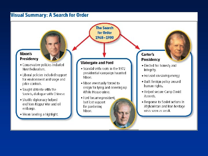 Key Features of Nixon’s Politics and Domestic Policies Nixon the Conservative • Believed the federal government was too large • Enacted “Southern Strategy” to appeal to former segregationists • Firm stand against crime and drug use Nixon the Liberal • Increased funding for domestic programs (i. e. food stamps &Social Security) • Took special interest in environmental issues • Created a new organization to prevent workrelated injuries and deaths (OSHA) • Advanced affirmative action