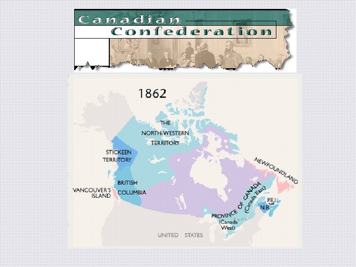 Key Ideas to Know • What does confederation mean? – A confederation is a group of people or organizations brought together for a common purpose • What came together to form Canada? – A number of colonies – They became provinces in a stronger unit, the nation • What kind of government resulted? – A two levels of government with a division of powers: • Provincial weak • Federal strong – Federal has most powers (central focus)