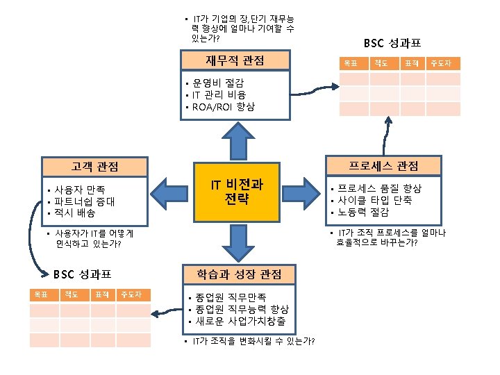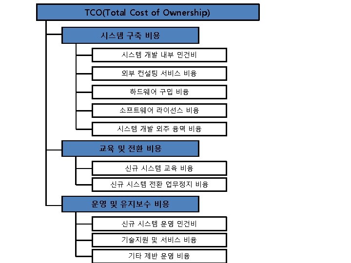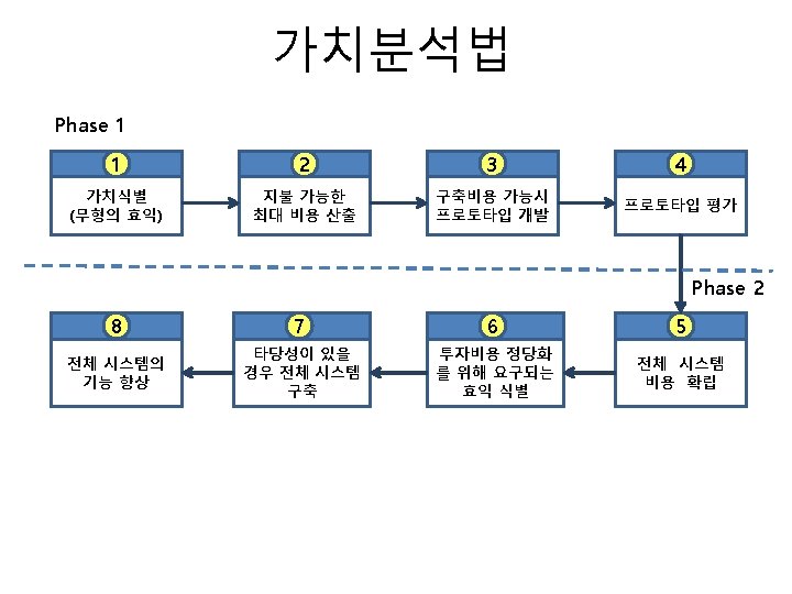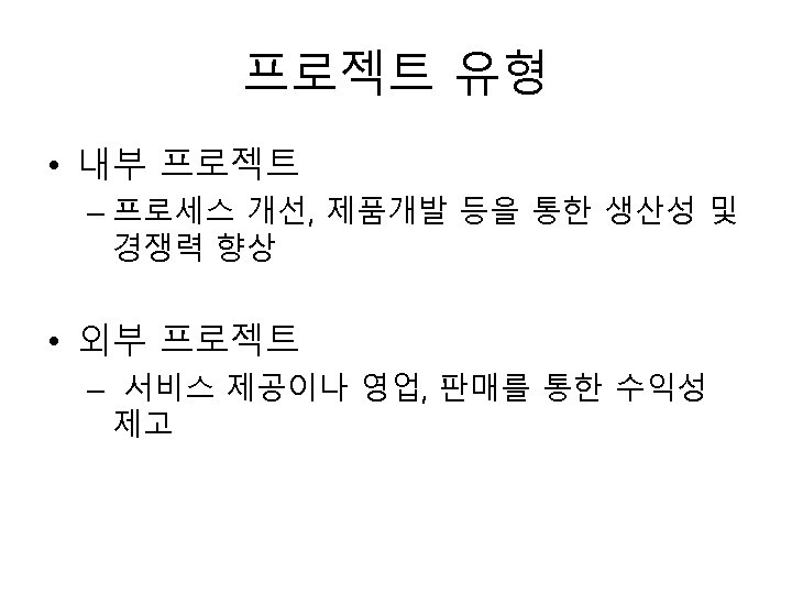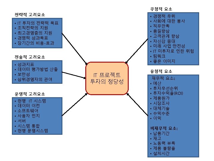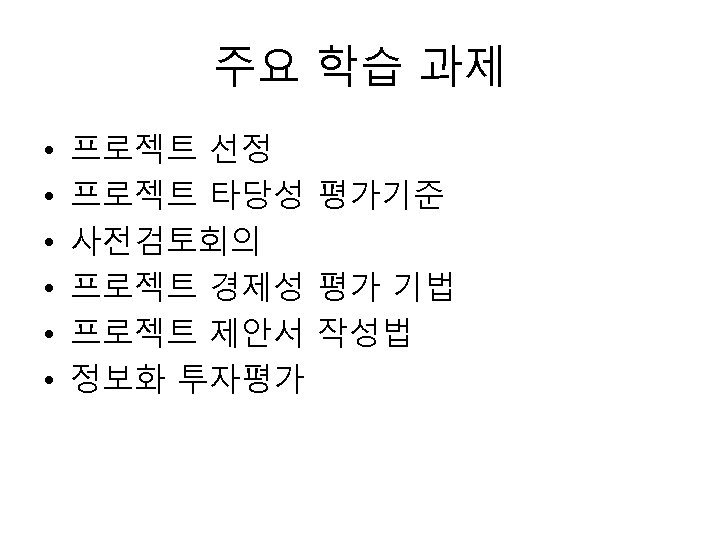 프로젝트 타당성 분석 • 타당성 분석의 종류 – – – Technical feasibility Economic feasibility Legal feasibility Operational feasibility Schedule feasibility • 타당성 분석 기준 – – Market feasibility Internal readiness Financial feasibility Design feasibility