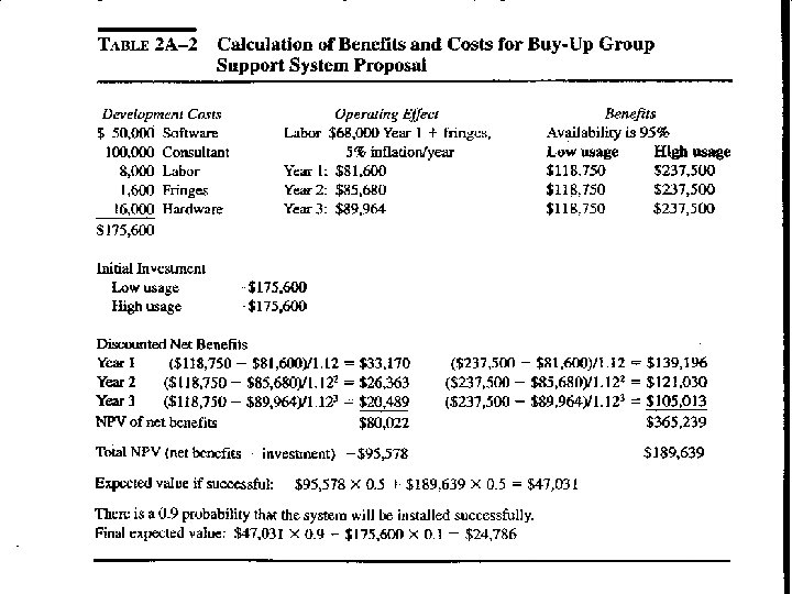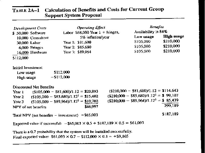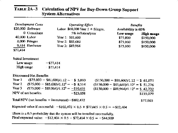 Cost/Benefit Analysis • To identify accurate measures of benefits and cost in monetary terms • Ratio of benefit / cost • Ex) purchase of a new automated machine – Table 2 -7, 2 -8 • Payback period method • The time value of money – Net Present Value(NPV) – Internal Rate of Return(IRR) • Other facotors