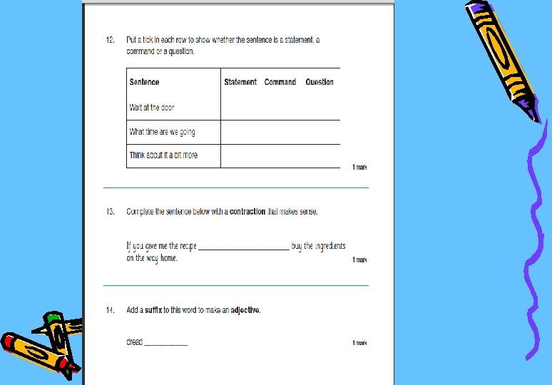 Grammar, spelling and punctuation test The new English test (2 years ago) will assess vocabulary, sentence-grammar, spelling and punctuation. Children will be assessed by a series of shortanswer questions in a variety of ways. Spelling: children will be tested on 20 words with different spelling patterns