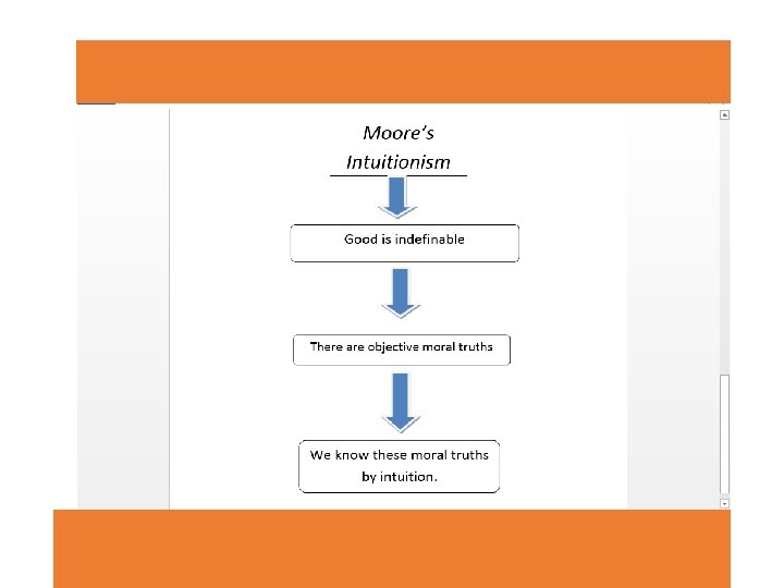 Intuitionism: G. E. Moore ‘Principia Ethica’ A summary. . . Ethics come from intuition. • “We know what good is, but we cannot actually define it. ” • Goodness is indefinable Like yellow. We know what is yellow and can recognise it but we cannot actually define it or describe particular qualities of it. • Did not believe human intuition was infallible (perfect). • Statements can be true/false (cognitive) • Cannot use senses to tell whether something is good but moral intuition.