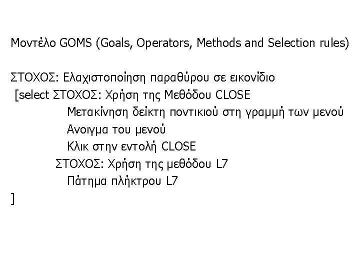 GOMS is a modeling technique (more specifically, a family of modeling techniques) that analyzes the user complexity of interactive systems. It is used by software designers to model user behavior. The user's behavior is modeled in terms of Goals, Operators, Methods and Selection rules. Briefly, a GOMS model consists of Methods that are used to achieve Goals. A Method is a sequential list of Operators that the user performs and (sub)Goals that must be achieved. If there is more than one Method which may be employed to achieve a Goal, a Selection rule is invoked to determine what Method to choose, depending on the context. (http: //www. cs. umd. edu/class/fall 2002/cmsc 838 s/tichi/printer /goms. html)