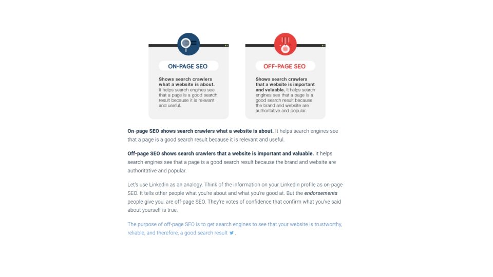 3) Off-Site SEO Off-page SEO techniques help strengthen the influence and relationship your website has with other websites. Most off-site SEO relates to high–quality backlinks (more on types of backlinks).