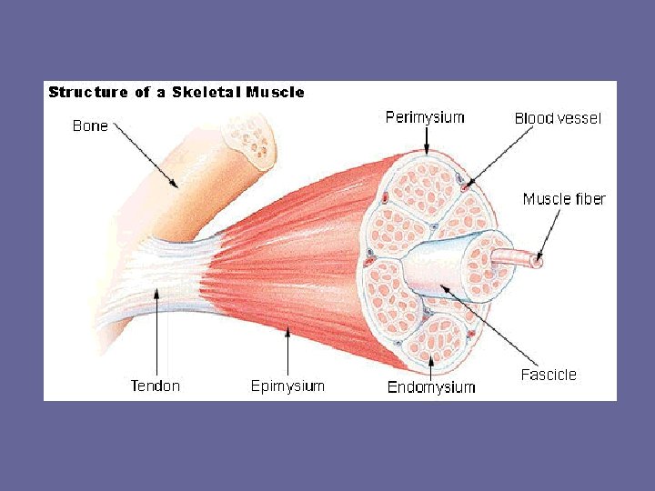 Attachment of Muscles to Bones • Skeletal muscles are attached to bone by way of tough cords of fibrous connective tissue called tendons. • In certain cases, the fibrous tissue is spread out into a broad sheet called an aponeurosis. • The tendon (or aponeurosis) fuses with the epimysium of the muscle and the periosteum (connective tissue around the bone) of the bone.