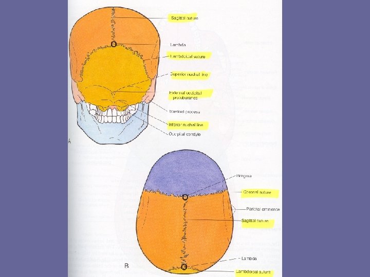 Landmarks • Posterior – External occipital protrudence – Superior and highest nuchal line • Anterior – Sagittal suture – Coronal suture – Lambdoid suture • Cranium houses brain – Above eyes and around back of ears