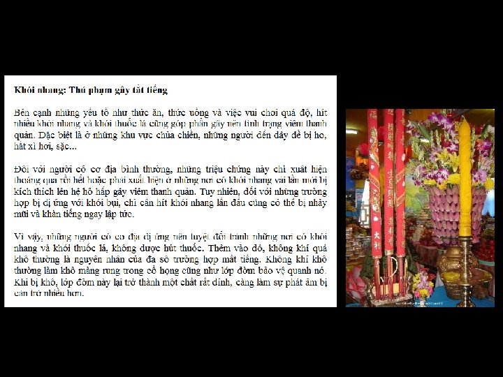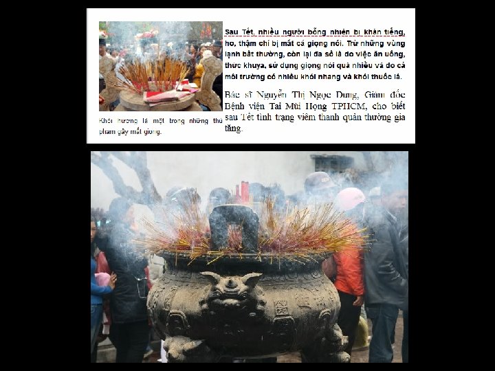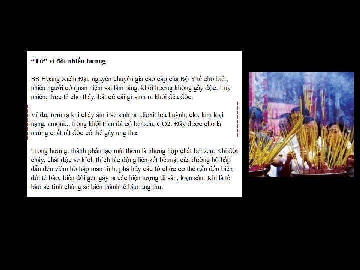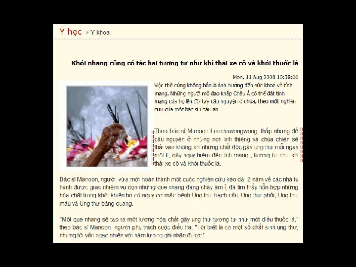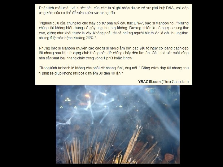 Kính thưaa quí bạn đó là Việt Nam ta nói hay dựa vào bài viết của “Tây” mà nói. Đến đây tôi xin chụp ảnh mấy trang do ngoại quốc viết về hương khói nhang đèn từ một webpage về đạo Phật của “Tây” coi họ nói sao cho biết. Nói thật ngắn là bác sĩ Manoon sau hai năm theo dõi nghiên cứu thấy trong khói nhang có nhiều chất gây ung thư máu, phổi và bàng quang.
