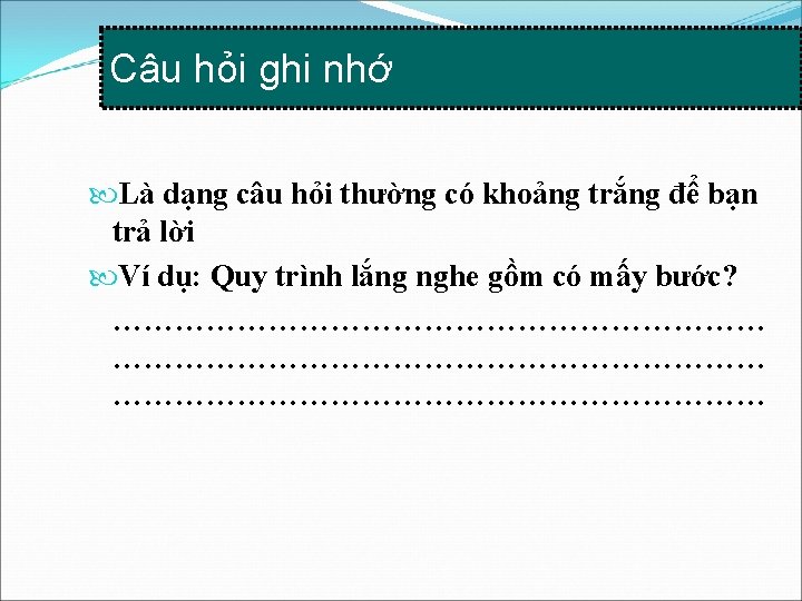 Ghi nhớ (Remembering) 1 2 3 • Xem xét lại toàn bộ nội dung đã ghi chép • Bổ sung các nội dung còn thiếu, chú thích • Ghi nhớ những gì đã ghi chép được