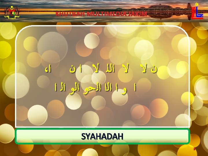 KHUTBAH MULTIMEDIA JAKIM . ﺍﻻ ﺍ ﺍ ﺍ ﺍ ، ﻻ ﻻ ﺍﻟﻠ ﻵ Aku bersaksi bahawa tiada tuhan yang disembah melainkan Allah yang Maha Esa dan tiada sekutu bagi-Nya. Aku juga bersaksi bahawa penghulu dan Nabi kami Muhammad SAW adalah hamba dan rasul-Nya penghulu segala makhluk dan manusia. 25