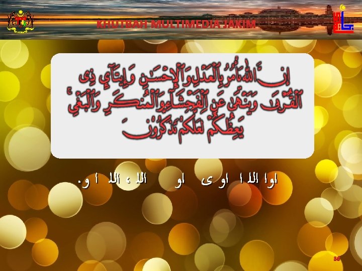 KHUTBAH MULTIMEDIA JAKIM . ﺍ ﺍﺍ ، ﻟ ﺍﻟ ﻯ ﺍﻟ ﻻ ﺍﺍ Ya Allah anugerahkanlah rahmat ke atas Raja-raja kami dan pemimpin-pemimpin kami yang melaksanakan kebenaran dan menegakkan keadilan 30