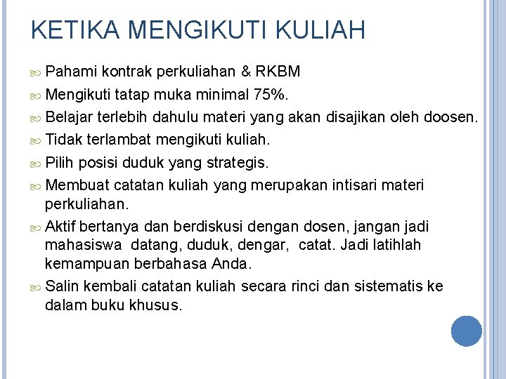 KETIKA MENGIKUTI KULIAH Pahami kontrak perkuliahan & RKBM Mengikuti tatap muka minimal 75%. Belajar terlebih dahulu materi yang akan disajikan oleh doosen. Tidak terlambat mengikuti kuliah. Pilih posisi duduk yang strategis. Membuat catatan kuliah yang merupakan intisari materi perkuliahan. Aktif bertanya dan berdiskusi dengan dosen, jangan jadi mahasiswa datang, duduk, dengar, catat. Jadi latihlah kemampuan berbahasa Anda. Salin kembali catatan kuliah secara rinci dan sistematis ke dalam buku khusus.