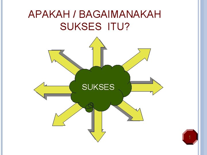 APAKAH SUKSES ITU? Sukses adalah menikmati keberhasilan pencapaian cita-cita. Jadi orang bisa disebut sukses bila: 1) Punya cita-cita 2) Bisa berhasil mencapai cita-cita 3) Menikmati keberhasilan mencapai cita.