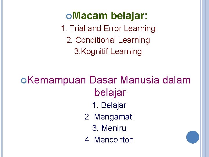 Macam belajar: 1. Trial and Error Learning 2. Conditional Learning 3. Kognitif Learning Kemampuan Dasar Manusia dalam belajar 1. Belajar 2. Mengamati 3. Meniru 4. Mencontoh