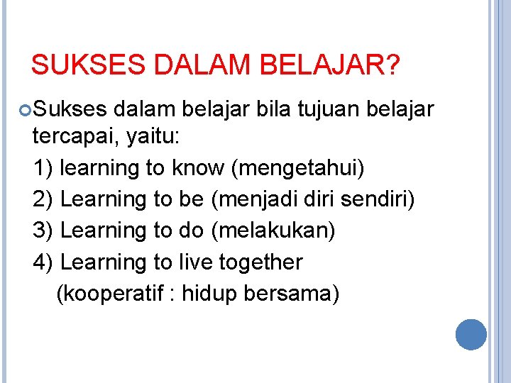 SUKSES DALAM BELAJAR? Sukses dalam belajar bila tujuan belajar tercapai, yaitu: 1) learning to know (mengetahui) 2) Learning to be (menjadi diri sendiri) 3) Learning to do (melakukan) 4) Learning to live together (kooperatif : hidup bersama)