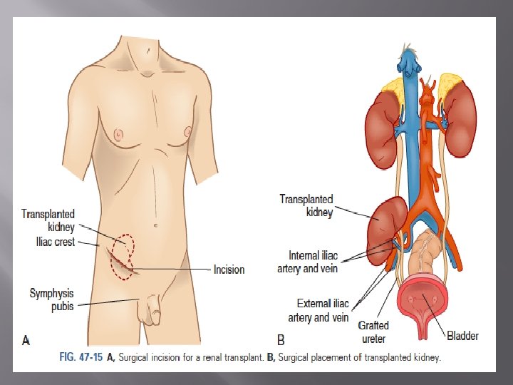 Surgical procedure cont. � Kidney transplant recipient: 3 -4 hours’ surgery. Installation of antibiotics in bladder to decrease risk of infection through catheter. � Crescent –shaped incision is made extending from the iliac crest to the symphysis pubis. � Transplanted kidney is usually placed extraperitoneally in the right ilia fossa. � Anastomoses of the blood vessels and ureter and minimize the occurrence of paralytic ileus Rapid revascularization is critical to prevent ischemic injury to kidney.