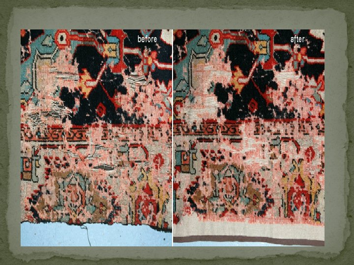 � x Zamanla oluşabilecek aşınmalara ve yırtılmalara karşı tekstil eserinin dokumasını sağlamlaştırmak gerekli � x Tekstil eserinin kendi özelliklerini devam ettirmesi için eseri hazırlama � x Tekstil eserini önceki görümüne ulaştırma �