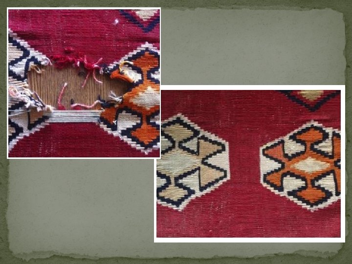 �Dokuma eserlerinde kullanılan ipliklerin bozulması çok kolaydır. Yaşam süreçleri taş, seramik ve cam eserlere göre daha kısadır. � Restoratör bir kirkitli dokumanın restorasyonuna başlamadan önce eserin iplik büküm sayısına, iplik numarasına, kullanılan iplik çeşitlerinin aynı olmasına, eserde kullanılan düğüm çeşidine ve dokuma tekniğine dikkat etmek zorundadır.