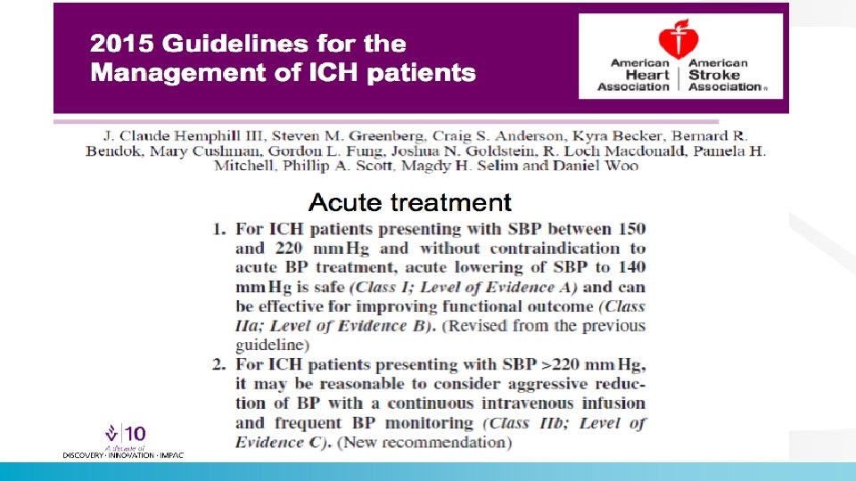 2017 GUIDELINE For Hypertention Acute Intracerebral Hemorrhage COR IIa III: Harm LOE C-EO A Recommendations for Management of Hypertension in Patients With Acute Intracerebral Hemorrhage (ICH) In adults with ICH who present with SBP greater than 220 mm Hg, it is reasonable to use continuous intravenous drug infusion and close BP monitoring to lower SBP. Immediate lowering of SBP to less than 140 mm Hg in adults with spontaneous ICH who present within 6 hours of the acute event and have an SBP between 150 mm Hg and 220 mm Hg is not of benefit to reduce death or severe disability and can be potentially harmful. J Am Coll Cardiol. Sep 2017, 23976