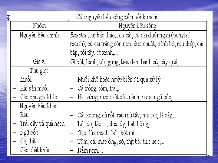 III. Quá trình sản xuất kimchi. 1. Các yếu tố tham gia quá trình sản xuất a. Nguyên liệu làm kimchi. b. Vi sinh vật lên men kimchi: