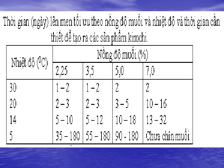 b. Điều kiện cho sự phát triển của vi sinh vật lên men kimchi. • Nguyên liệu, phụ gia, nồng độ muối và nhiệt độ • • lên men là các thành phần ảnh hưởng đến chất lượng kimchi và sự phát triển của vi khuẩn. Tốc độ lên men của kimchi ảnh hưởng bởi nồng độ muối và nhiệt độ. Kimchi tối ưu có (0, 6 -0, 8) % độ acid, p. H 4, 2, muối 3%, và acid hữu cơ bay hơi cao. Khi nồng độ muối tăng, p. H thấp quần thể vi sinh vật tối thiểu thấp và thời gian yêu cầu đạt tối đa lâu hơn.