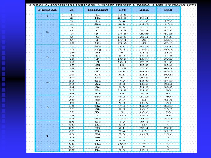 2. Potensial Ionisasi Potensial ionisasi adalah energi yang dibutuhkan untuk melepaskan elektron yang terikat paling lemah dari suatu atom dalam keadaan gas. Harga Potensial ionisasi Unsur utama terdapat pada Tabel 2 dan Tabel 3.