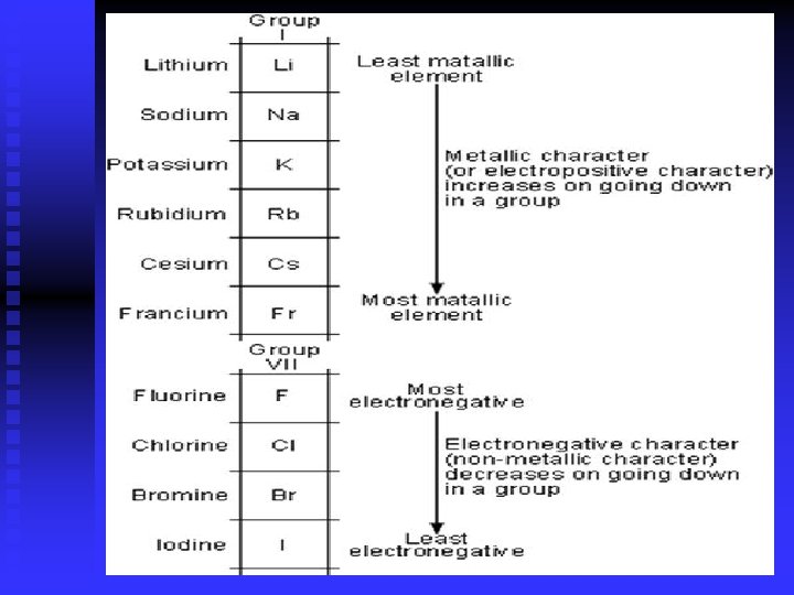 4. Sifat Logam Unsur-unsur yang terletak di sisi kiri tabel periodik bersifat logam dan sifat logamnya dari golongan atas ke bawah semakin besar (semakin elektropositif). Unsur-unsur yang terletak di sisi kanan tabel periodik dari golongan atas ke bawah semakin besar semakin bersifat logam (semakin elektronegatif)